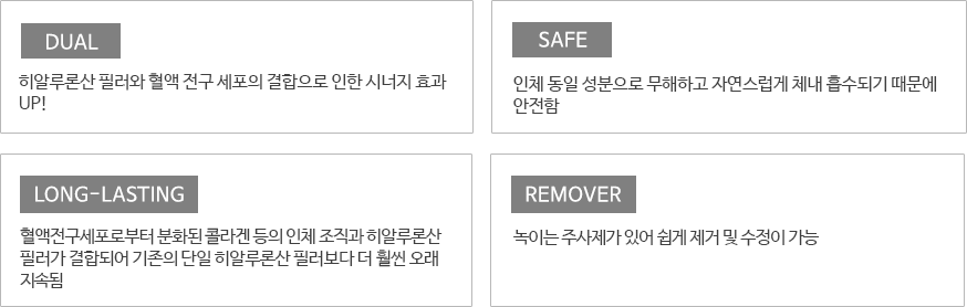 히알루론산 차바이오 티슈필필러와 자가 혈액 채취 후 혈액 세포를 분리하는 키트를 이용하여, 혈액 전구세포(줄기세포 성장인자 등)를 함께 혼합되어 사용하는 혁신적인 신개념 필러입니다.
